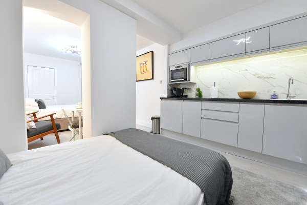 The studio has a full kitchen, Double Bed, seating, Sofa dining table in the one single room.